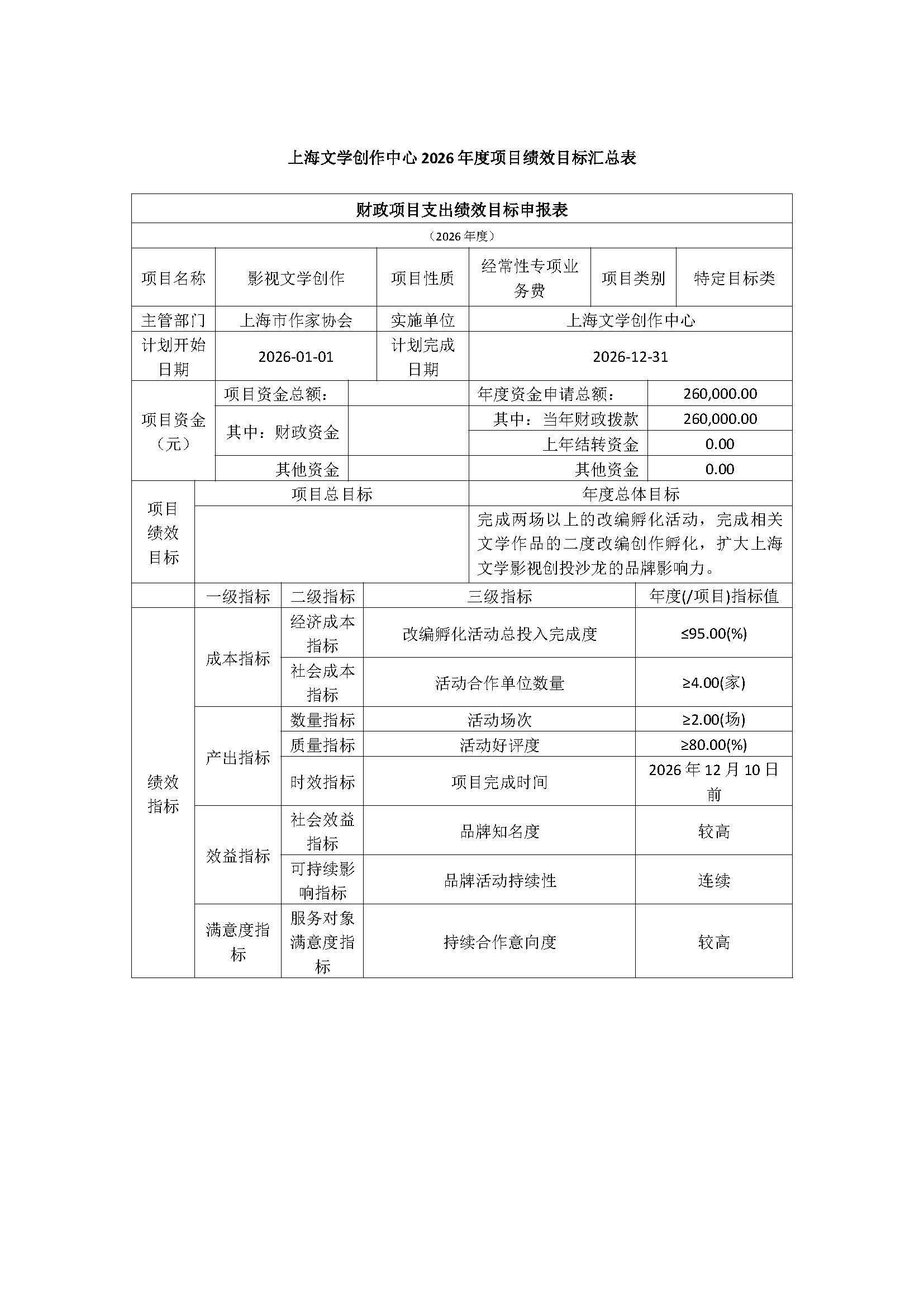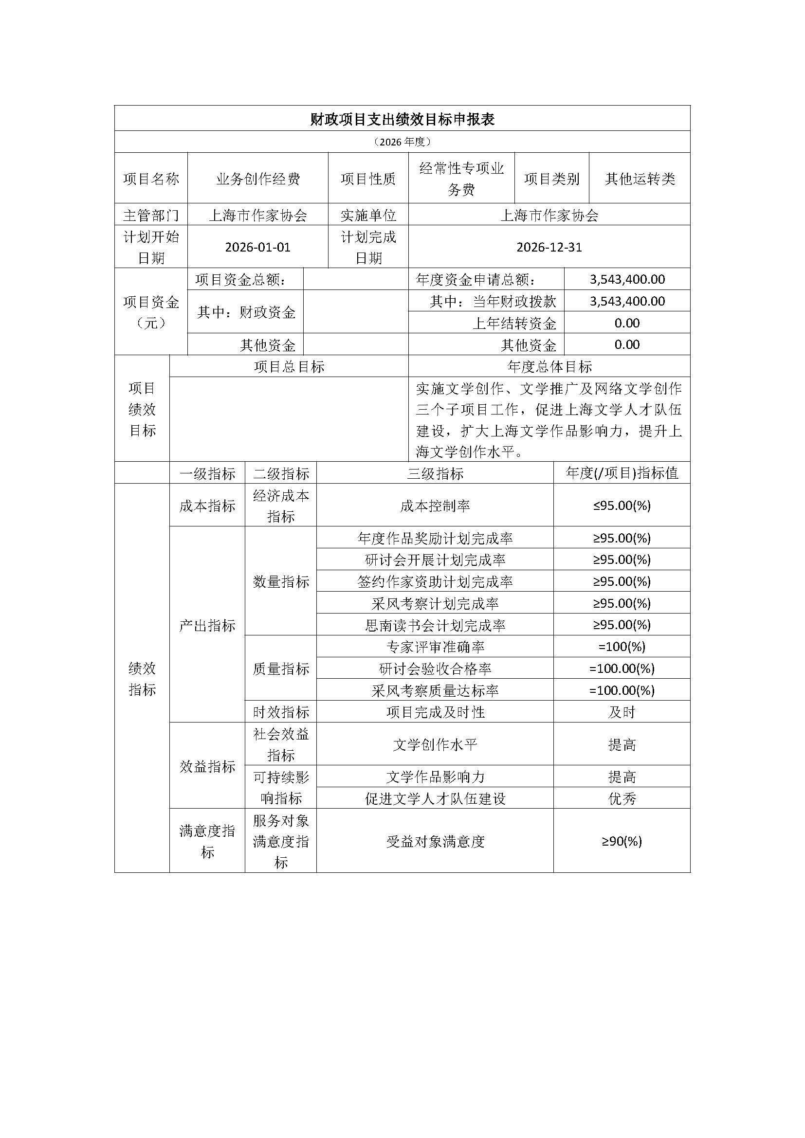 上海市作家协会本级2026年度项目绩效目标