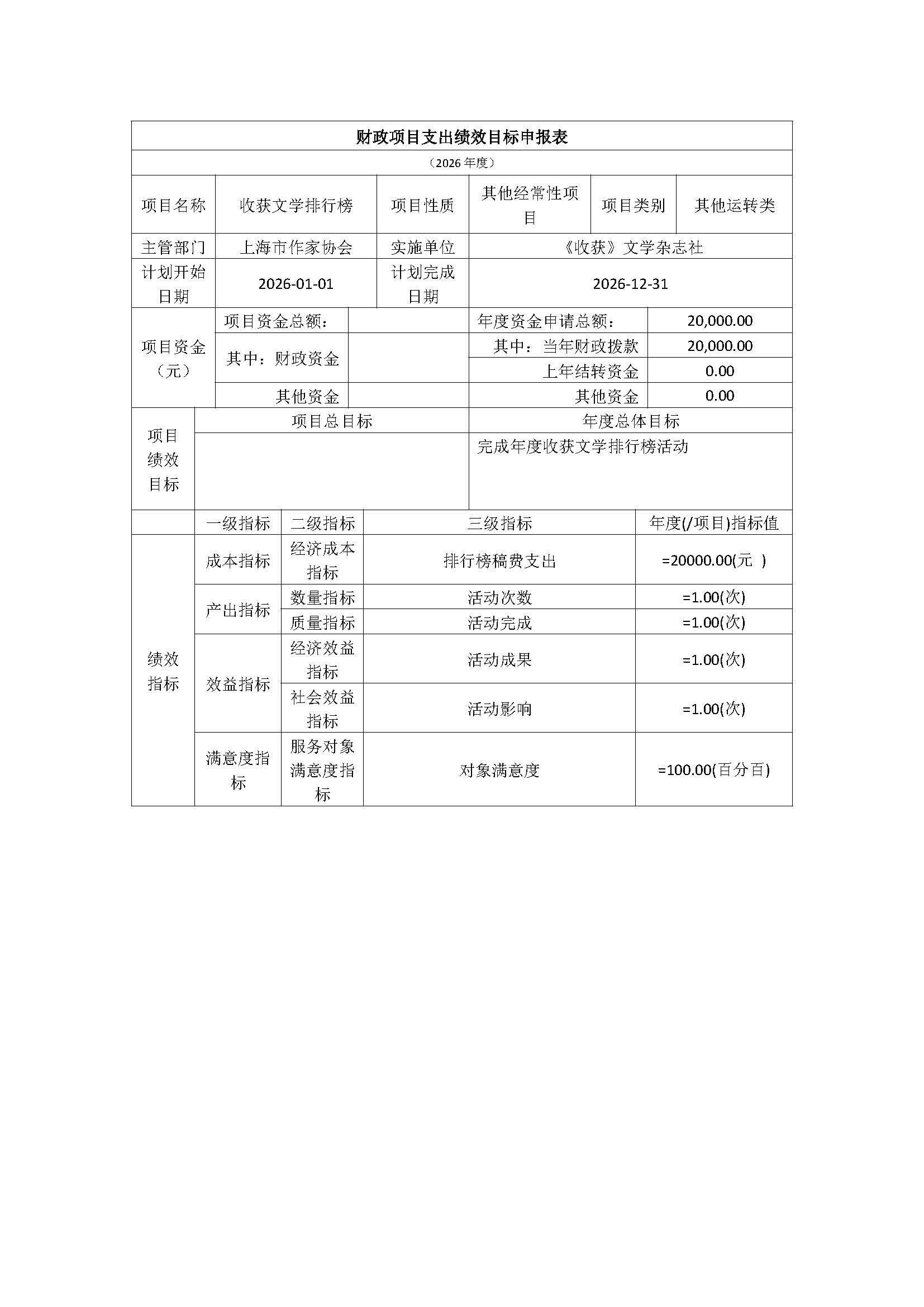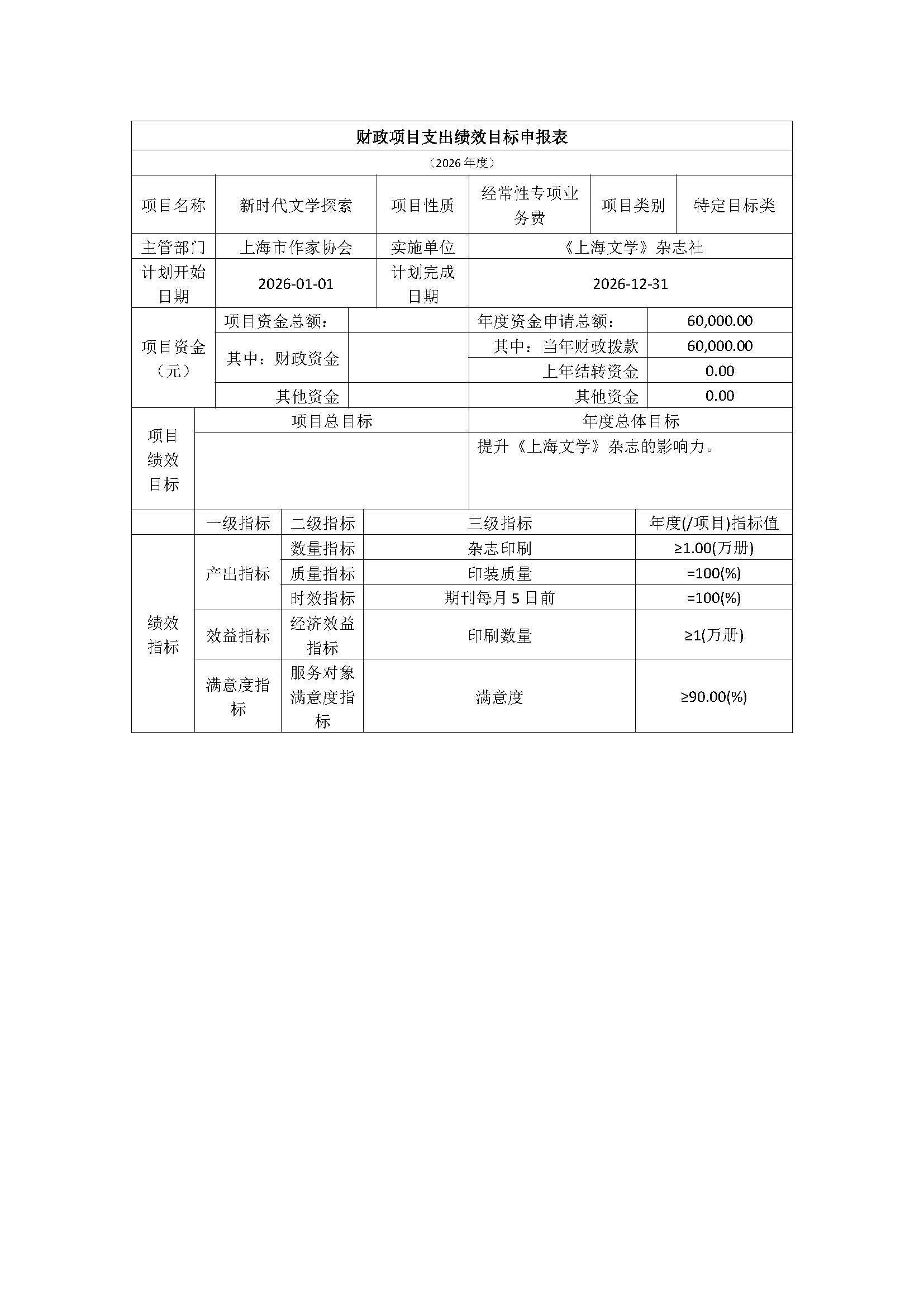 《上海文学》杂志社2026年度项目绩效目标